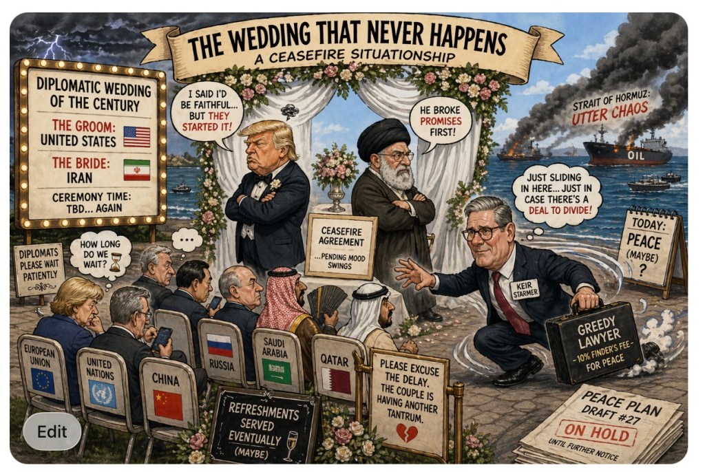One minute, Donald Trump is vowing commitment—“this ceasefire will be beautiful, the best ceasefire”—and the next, it’s toys out of the pram and sabres rattling like someone just read their ex’s messages. The result? A full diplomatic wedding setup… minus the bride, the groom, and any actual agreement. 💒🚫