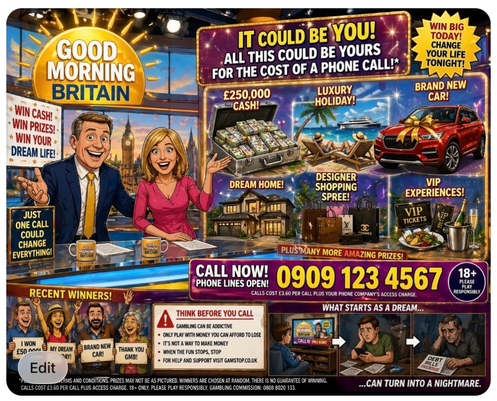 Wake up, switch on the telly, and before your brain has even clocked in for the dayβboomβyouβre being told your life could change foreverβ¦ for the price of a phone call. Forget education, careers, or long-term planning. Apparently, destiny now runs on premium-rate numbers and cheerful presenters with suspiciously perfect teeth.