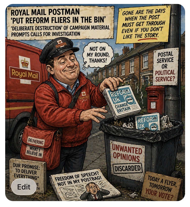 Now? Allegations that campaign leaflets from Reform UK were quietly binned by a Royal Mail postman have people asking whether the postbag has started developing… political preferences.