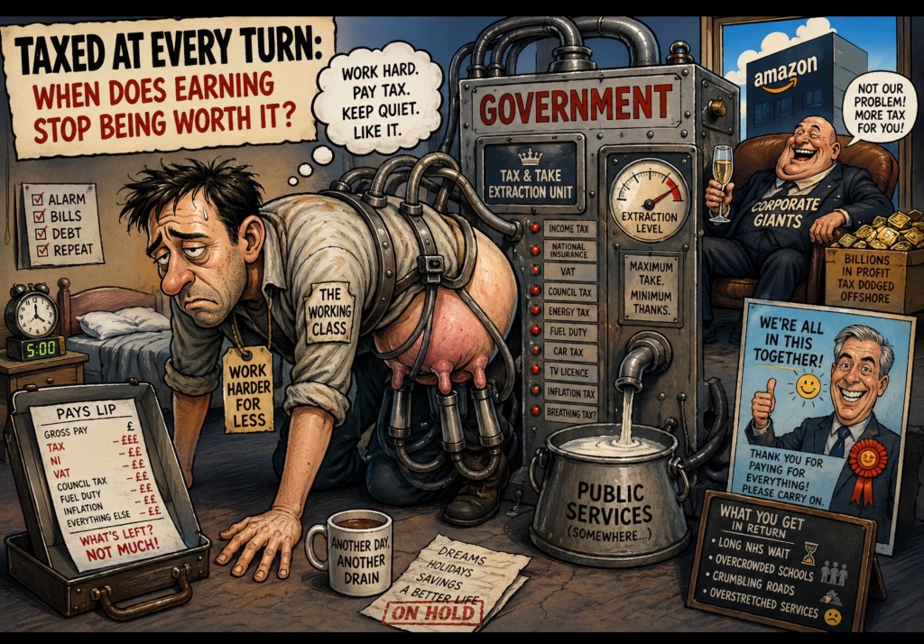 From rising taxes to stagnant wages, the squeeze isn’t subtle anymore—it’s a full-body economic headlock. And while billion-pound giants like Amazon continue to orbit comfortably above the chaos, the everyday worker is left wondering if effort itself has become a taxable offence.